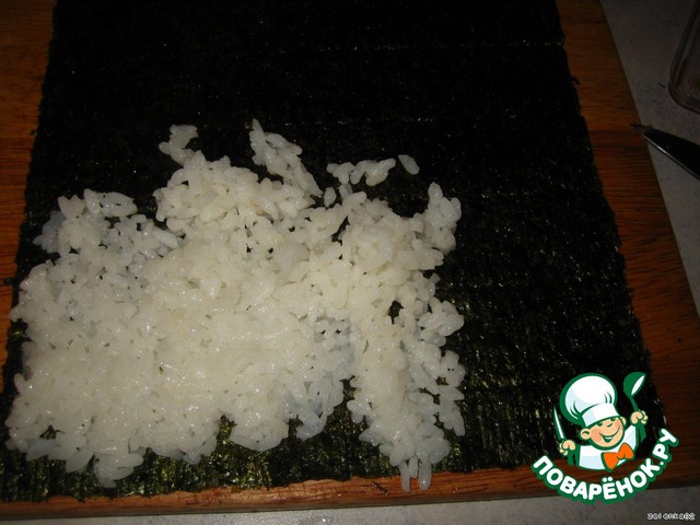 Выкладываю на лист нори рис, по возможности ровным слоем.