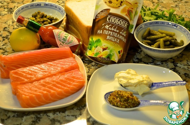 4. Слить лимонный сок, добавить мелко рубленные корнишоны, каперсы, майонез, горчицу, тархун и соль. Размешать. Добавить соус Табаско по вкусу. Лимон очистить от кожуры и разделить на сегменты.