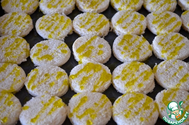 1. Вырезать из каждого кусочка тостового хлеба 4 кружка примерно по 4-5 см. Выложить на смазанный оливковым маслом противень. Сбрызнуть оливковым маслом. Запечь в духовке при температуре 150С 25 минут, чтобы получились хрустящие золотистые тосты. Это можно сделать за 2 дня до подачи. Готовые тосты уберите в герметичный контейнер и храните при комнатной температуре.
