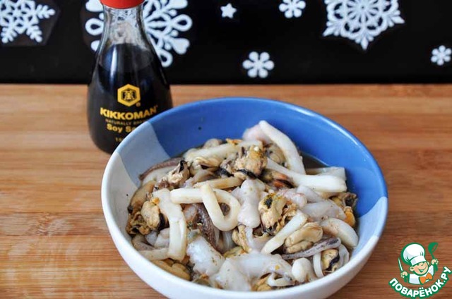 Морепродукты достать заранее и дать им самопроизвольно оттаять, положив в дуршлаг.