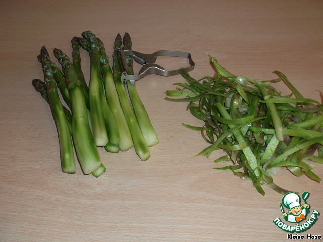 Спаржу можно брать любую - белую или зелёную. Мне показалось, что зелёная красивее будет смотреться, поэтому я готовила с ней. Зелёную спаржу очищаем три части снизу. Если спаржа белая - весь стебель полностью.