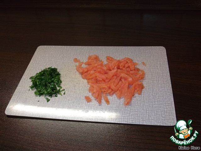 Теперь займёмся лососем и черемшой. 50 гр копченого лосося режем либо ленточками, либо кусочками. Пару веточек черемши измельчаем ножом.