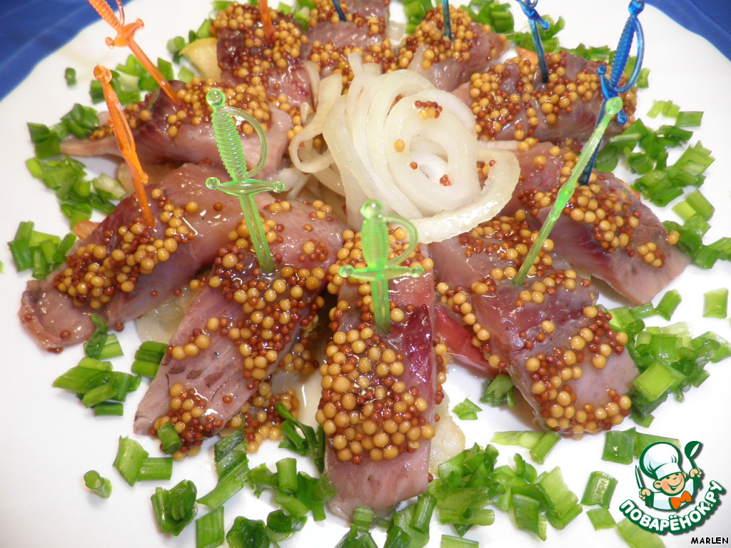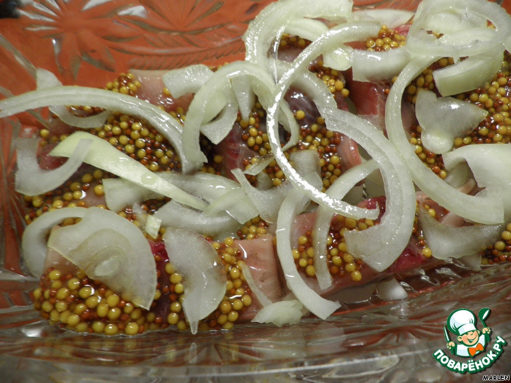 На дно тарелки или другой посуды выложить половину нарезанного лука, сверху разложить филе сельди, которое нарезать заранее на кусочки. Смазать сельдь горчицей.