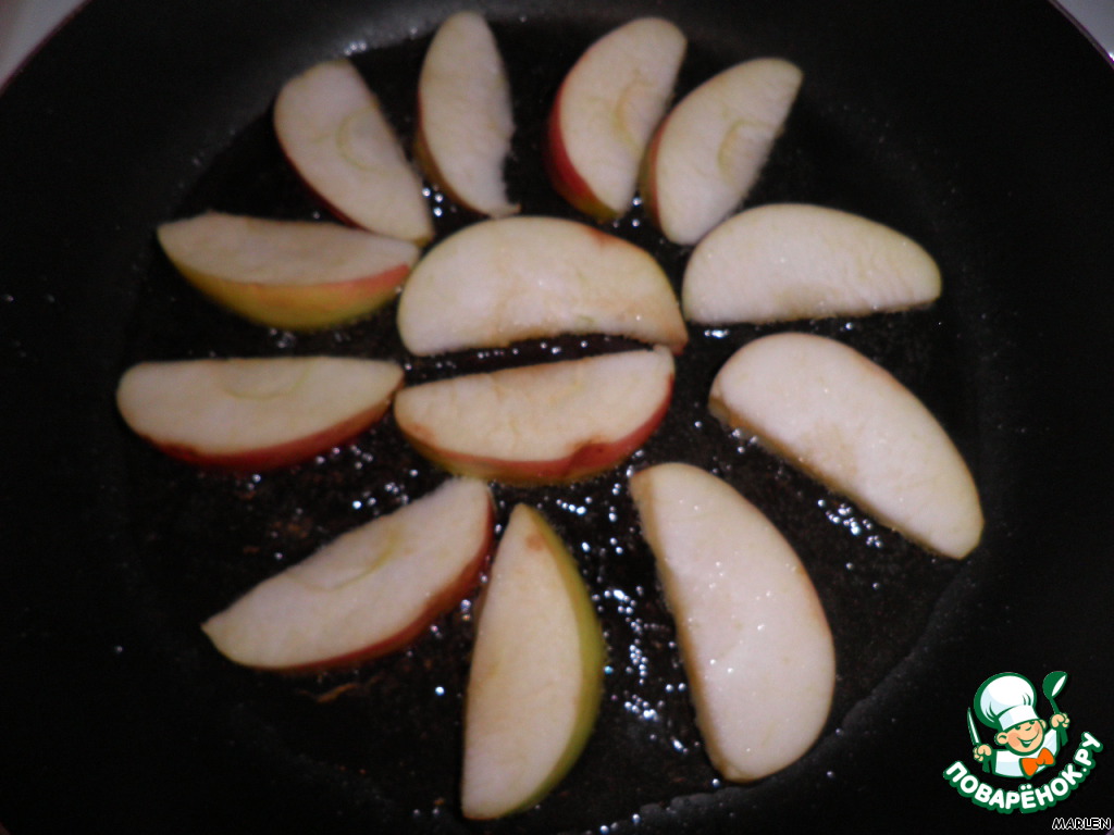Из яблок удалить сердцевину и нарезать полукруглыми дольками. Обжарить на растительном масле с двух сторон. Выложить на тарелку.