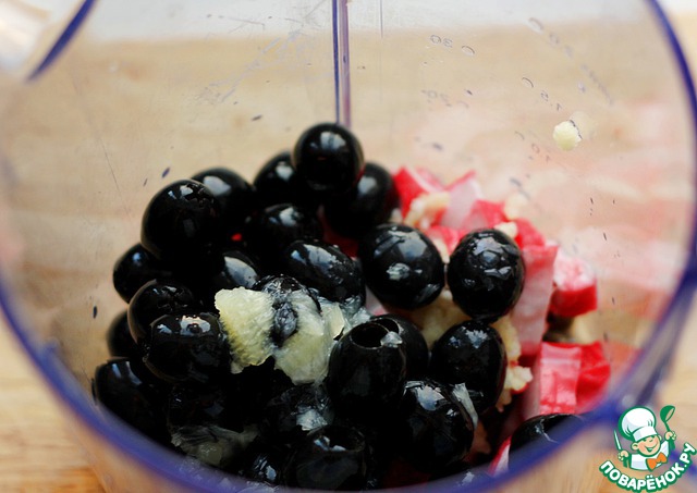4. В чашу блендера поместить каперсы, крабовые палочки и измельченный чеснок.