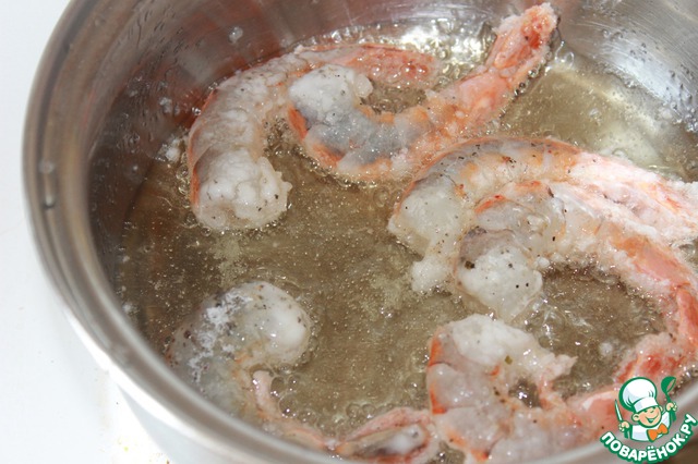 Креветки чистим до последней фаланги, оставляем хвостик, убираем кишечную венку, посыпаем смесью 5 перцев. Солим