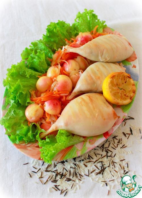 Фаршированные кальмары с пикантным овощным гарниром с яблоками или ранетками.