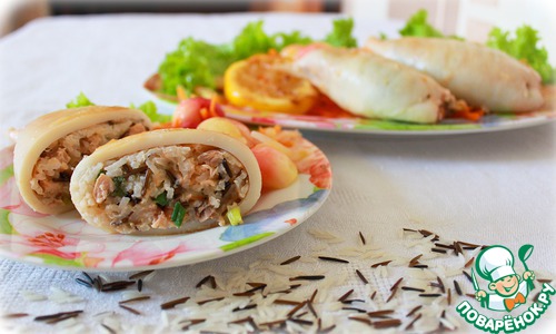 | Кальмар, фаршированный рисом "Смесь Басмати Mix" и лососем. С пикантным овощным гарниром с яблоками или ранетками. |