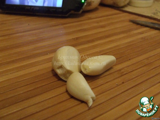 -В сковороде разогреваем масло, прокаляем чеснок и убираем.