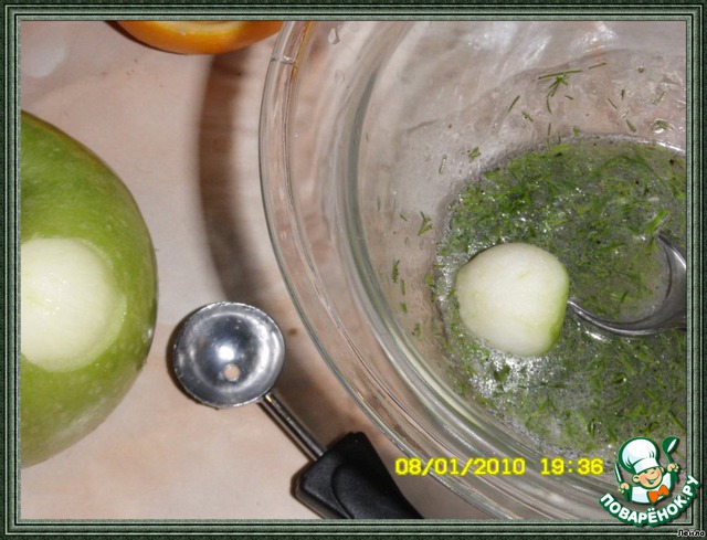 Из яблока ложечкой специальной (нуазеткой) вырезать шарики так, чтобы зеленая кожура была основанием.