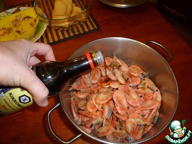 Выкладываем в кастрюлю креветки, добавляем пиво, соевый соус, выжимаем лимоны (или можно добавить нарезанный дольками лимон).