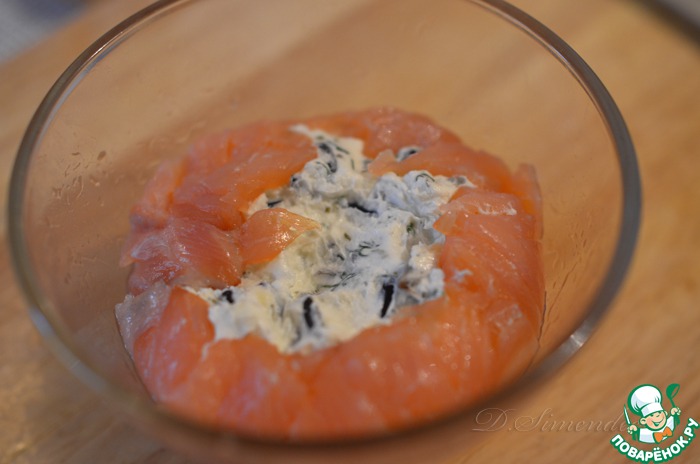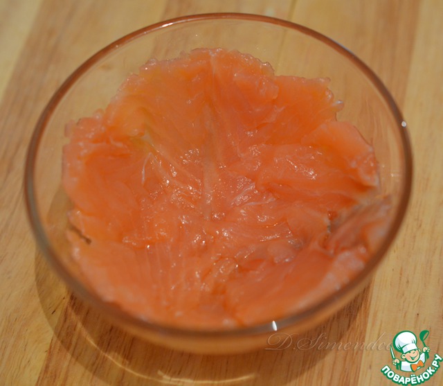 Семгу нарезать тонкими ломтиками и выстлать дно и стенки небольшой порционной пиалы.