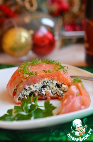 Из остатков семги закрыть дно мешочка. Поставить до начала празднования в холодильник не менее, чем на 2 часа.