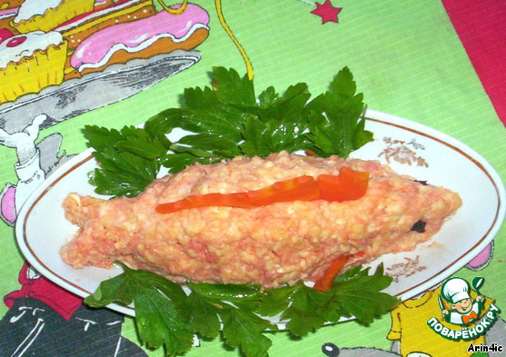 Охладить в холодильнике. Придать форму рыбы и украсить.