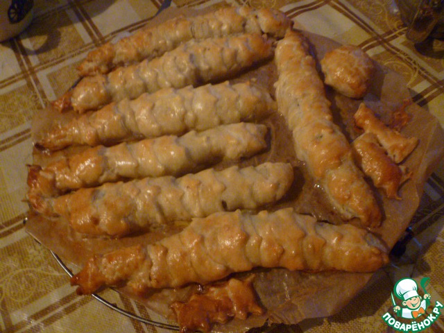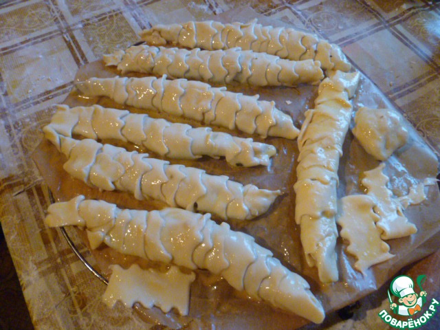 Каждую рыбинку начинаем с головы обматывать полосками теста внахлест. Выкладываем наши готовые мумии на противень с пергаментом.