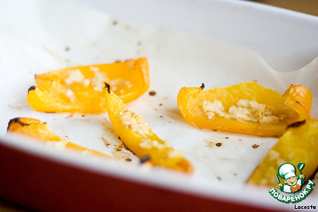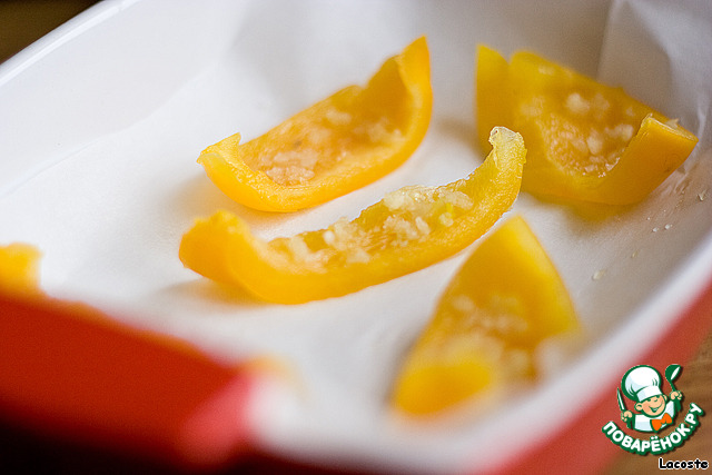 У перца срезать плодоножку, очистить его от семян, крупно нарезать. Натереть изнутри измельченным чесноком, сбрызнуть оливковым маслом. Запекать в духовом шкафу при 180-200°С в течение 20-30 минут.