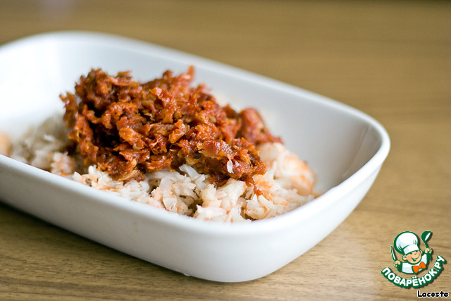 Вяленые помидоры измельчить в блендере или очень мелко нарезать. Соединить креветки и томаты, посолить, добавить перец и перемешать.