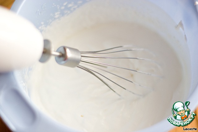 Сливки взбить до состояния густой сметаны или до твердых пиков (по вкусу).
