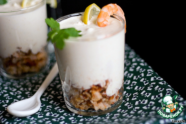 В стакан (бокал) выложить массу из креветок, сливочный соус. По желанию украсить лимоном или креветками. Охладить в холодильнике в течение 1-1,5 часов.