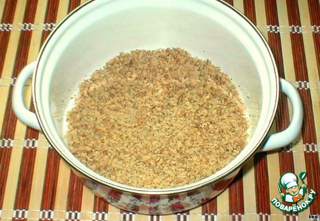 Орехи (только грецкие) истолочь, лучше в керамической посуде, но не через мясорубку, иначе все ореховое масло останется в ней.