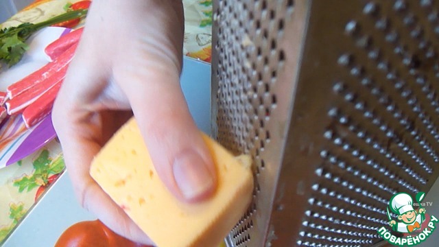1. Натираем сыр на мелкой терке, крабовые палочки на крупной терке. Измельчаем зелень.