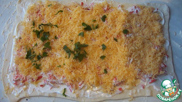 3. Смазываем тесто сметаной. Посыпаем крабовыми палочками, сыром (немного оставляем на потом) и зеленью.