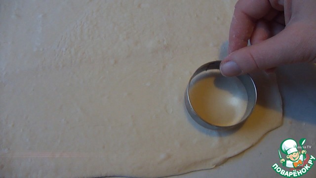 5. Раскатываем второй пласт и делаем из него кружочки-донышки. Соединяем кружочки и кусочки рулета. Посыпаем сверху сыром.