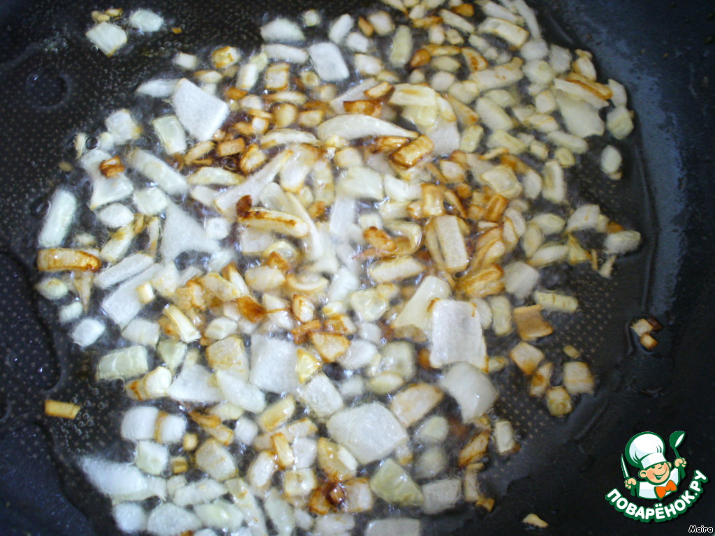 Лук мелко нашинковать, обжарить на растительном масле до золотистого цвета.