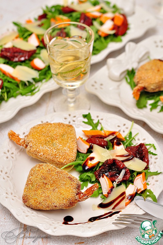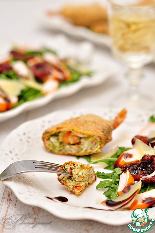 Польпетте с хрустящей корочкой, нежной начинкой из крабовых палочек, цуккини, крем-чиза, пармезана и неожиданным сюрпризом в виде креветки! Вкусно! Очень вкусно!