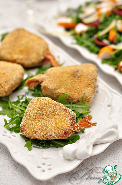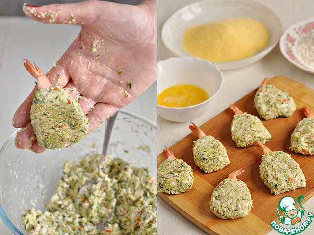 Креветку полностью "завернуть" в фарш, оставив хвостик наружу (для красоты), придав форму котлетки.