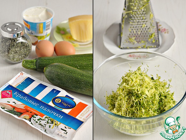 Цуккини вымыть, обсушить, натереть на мелкой тёрке. Присыпать солью 0,5 ч. л., перемешать и оставить так на 0,5 часа.