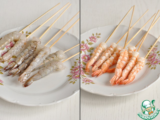 Креветки почистить, оставив хвостики, проткнуть их по всей длине шпажками и отварить в подсоленной воде до тех пор, пока не покраснеют.