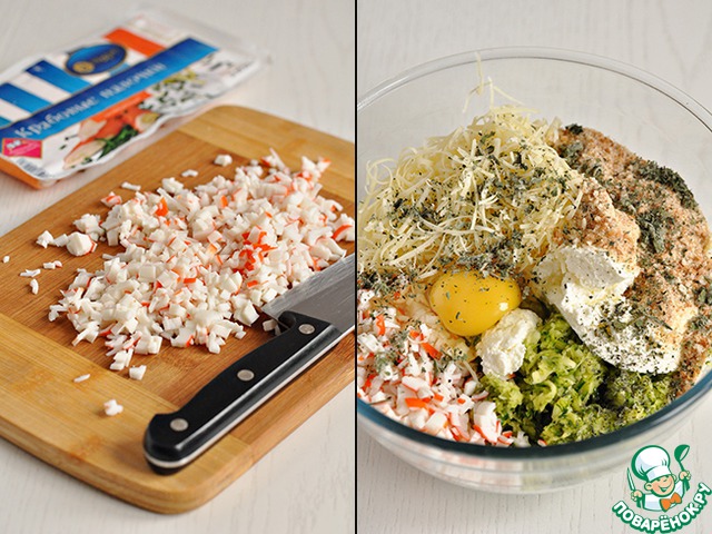 Цуккини полностью хорошо отжать руками от лишней воды. В чашку с цуккини добавить нарезанные крабовые палочки, сухари, натертый пармезан, творожный сыр (крем-чиз), яйцо, сухую мяту, соль, черный перец. Перемешать всё, попробовать на вкус, если нужно - досолить, доперчить.