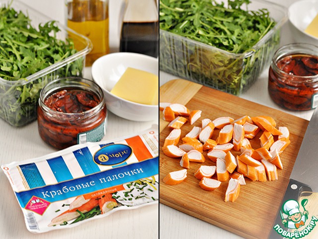 Для этого нам понадобится руккола, крабовые палочки, вяленые томаты, пармезан, оливковое масло и крем-бальзамик.