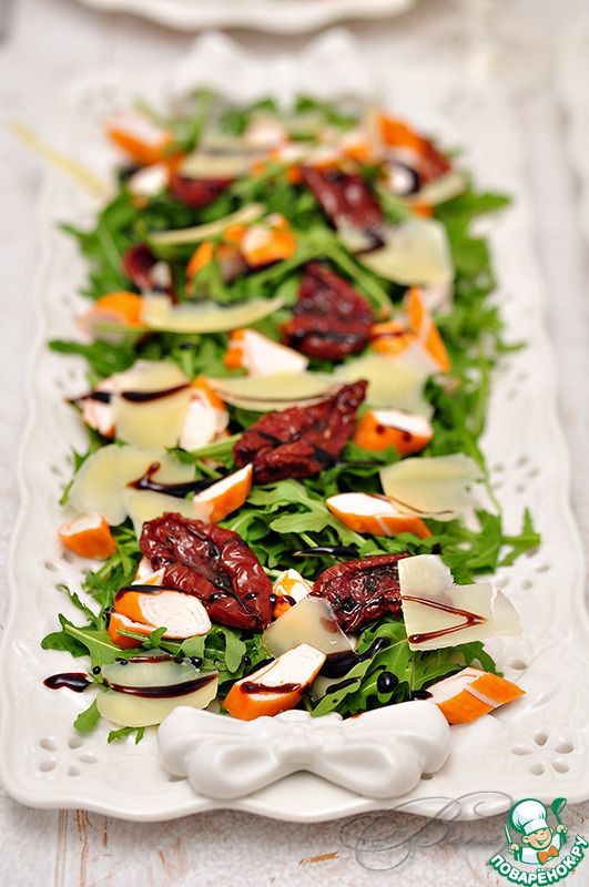 На дно блюда выложить рукколу, поверх рукколы разложить нарезанные наискосок крабовые палочки, вяленые томаты, пармезан, нарезанный пластинками при помощи овощечистки, сбрызнуть оливковым маслом и бальзамиком.