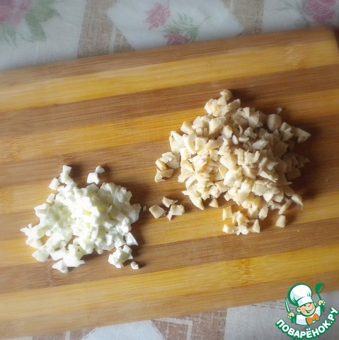 Яйцо отвариваем, отделяем белок от желтка. Желток оставляем для украшения, а белок нарезаем мелкими кубиками.