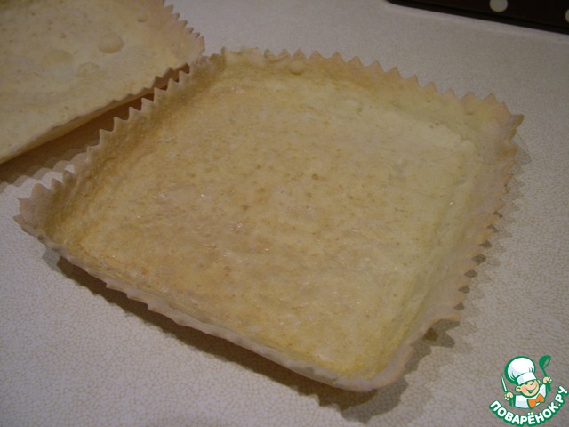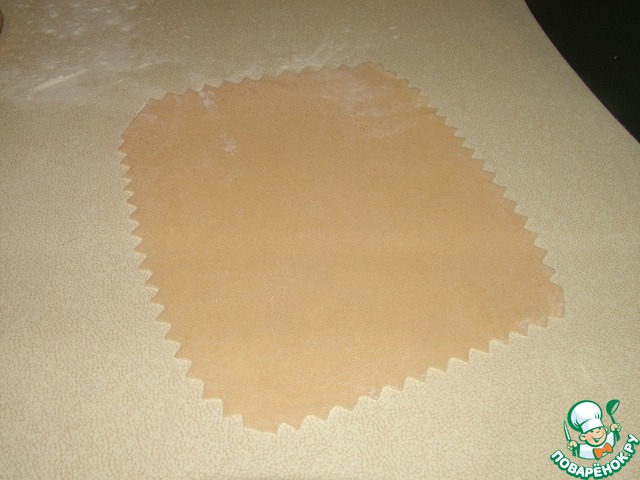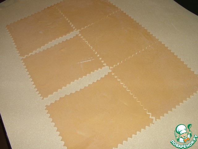 Раскатываем тонко тесто и нарезаем на куски нужного размера (ориентируемся на наши формы). Оставляем на 5-10 минут подсохнуть.