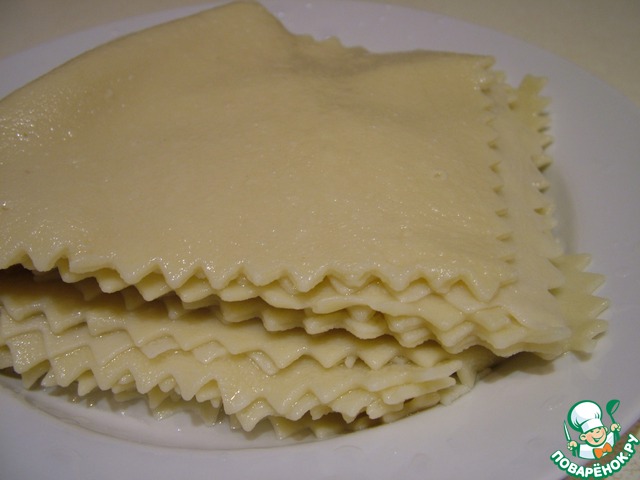Если у вас нет возможности купить готовые листы лазаньи, можно приготовить её в домашних условиях. Я сделала яичное тесто из 300 г. муки, 4 яиц и 10 г. сливочного масла.