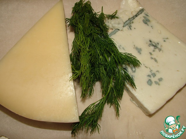 Для прослойки используем смесь сыров: твердых сортов и итальянскую горгонзолу. Если вы не любите сыр с плесенью, можете заменить горгонзолу на рикотту.