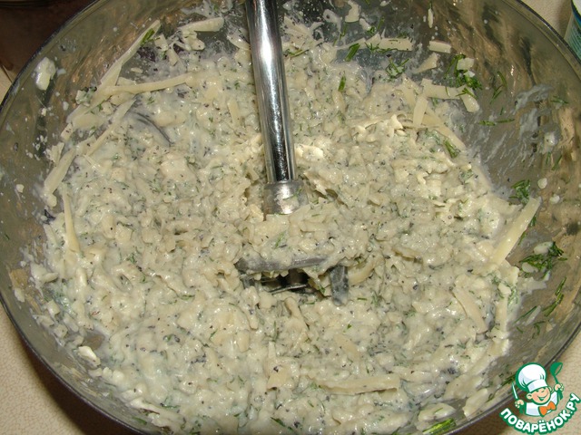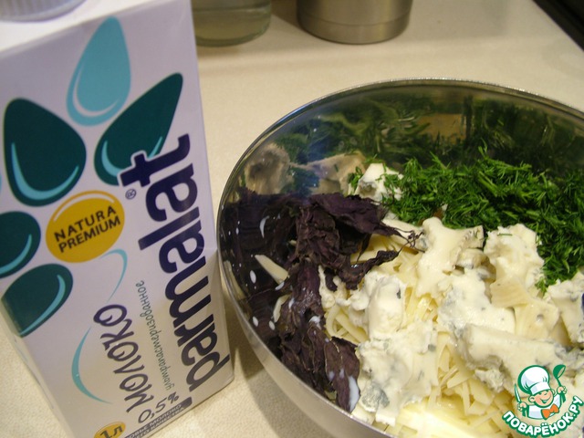 Натираем твердый сыр на терке, горгонзолу ломаем на кусочки, добавляем базилик и укроп, немного (около 50 г.) молока.
