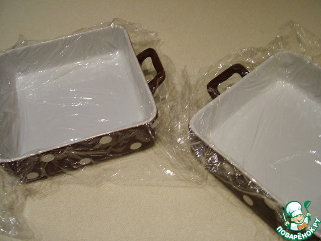 Для холодного варианта выстилаем пленкой формы (с запасом). В форму, чередуя, укладываем слоями лазанью, сырную смесь, рыбу и икру.