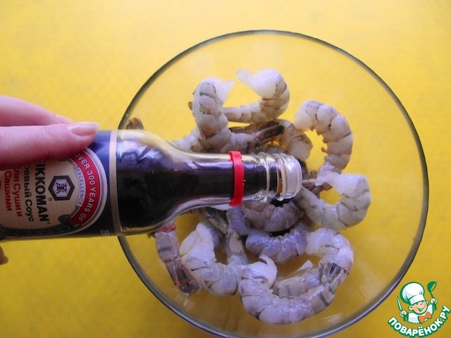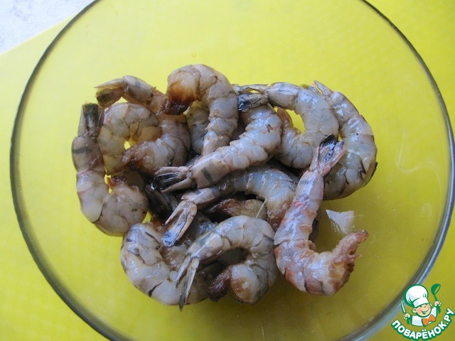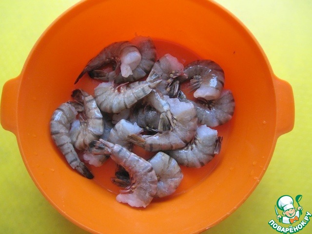 Креветки чистим от хитина и вынимаем кишечные венки. Хвостики оставляем.