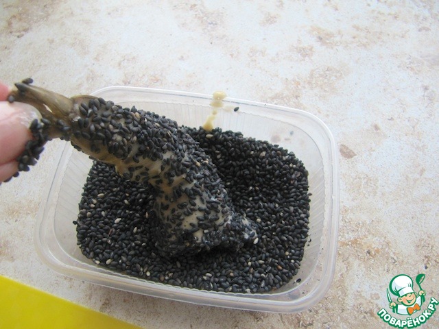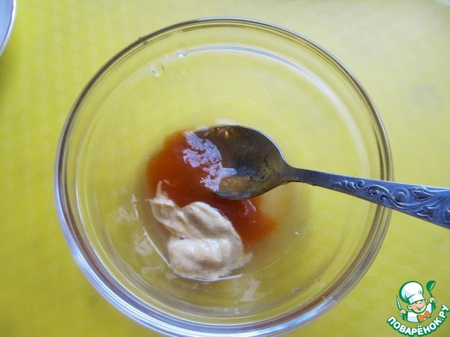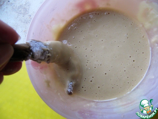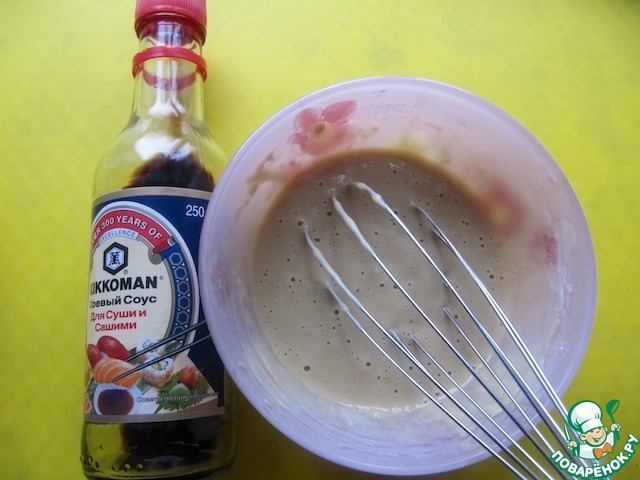 Для приготовления кляра смешать: 1 ст ложку соевого соуса, ледяную минеральную газированную воду, 1 яйцо. Всыпаем муку, разрыхлитель и перемешиваем венчиком до однородности несколькими движениями. Взбивать не нужно.