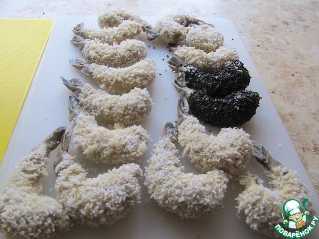 Затем выкладываем креветки на досточку и отправляем в холодильник на 40-60 минут, чтобы панировка "окрепла" и не соскакивала при обжарке. Это важный момент, не игнорировать!
