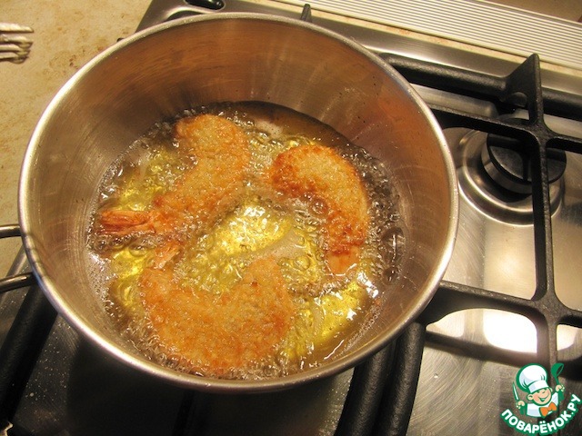 В разогретое растительное масло опускаем охлажденные креветки, жарим до золотистого цвета по 1 минуте с каждой стороны. Важно не пересушить!