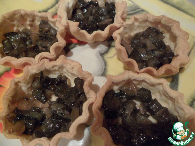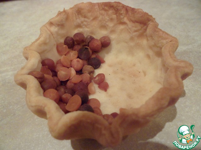 Вырезать круги из слоеного теста, положить в смазанные формочки для кексов тесто, сверху положить до верха горох, чтобы тесто не поднялось, и печь при 180 градусах 15 минут.