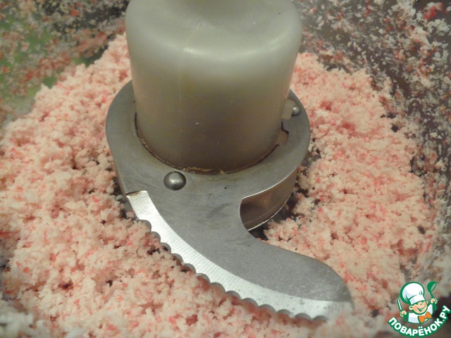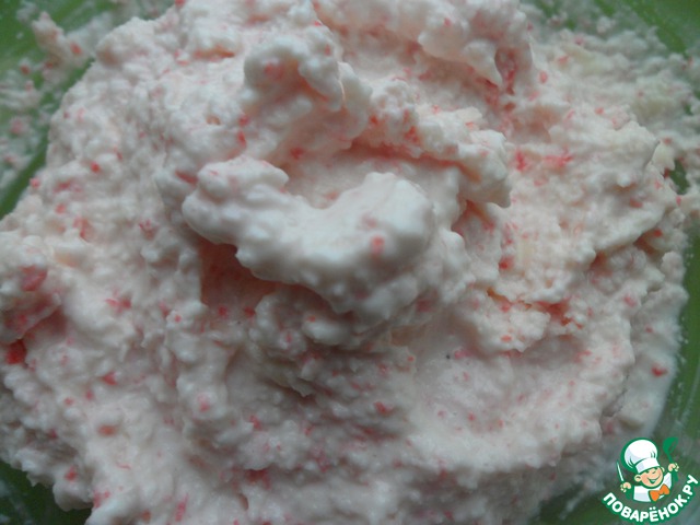 Делаем крем: измельчить 4 крабовые палочки в комбайне