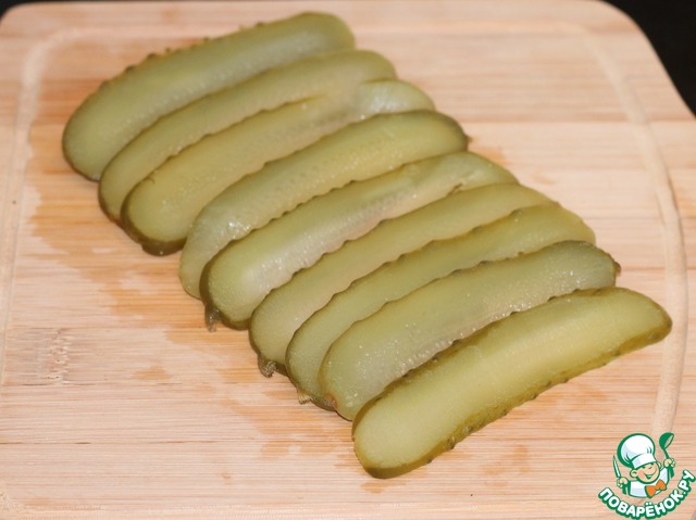 Маринованные огурчики или маринованный болгарский перец, можно и острый перец, нарежьте полосками.