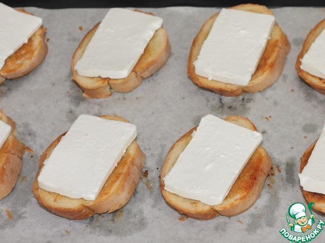 Смажьте ломтики багета этой смесью с двух сторон. Выложите ломтики на застеленный пергаментной бумагой противень. Запекайте багет в разогретой духовке по 5 минут с каждой стороны.