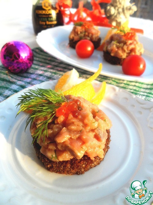 На гренки сверху выложить готовый тартар. Можно украсить сверху красной икрой.